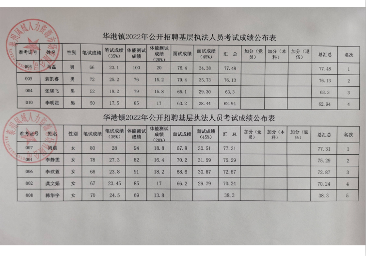 華港鎮(zhèn)2022年公開招聘基層執(zhí)法人員考試成績(jī)表